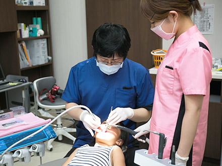 専用の器具を使い、歯のお手入れを行います。普段の歯磨きでは取りきれない汚れを落とします。